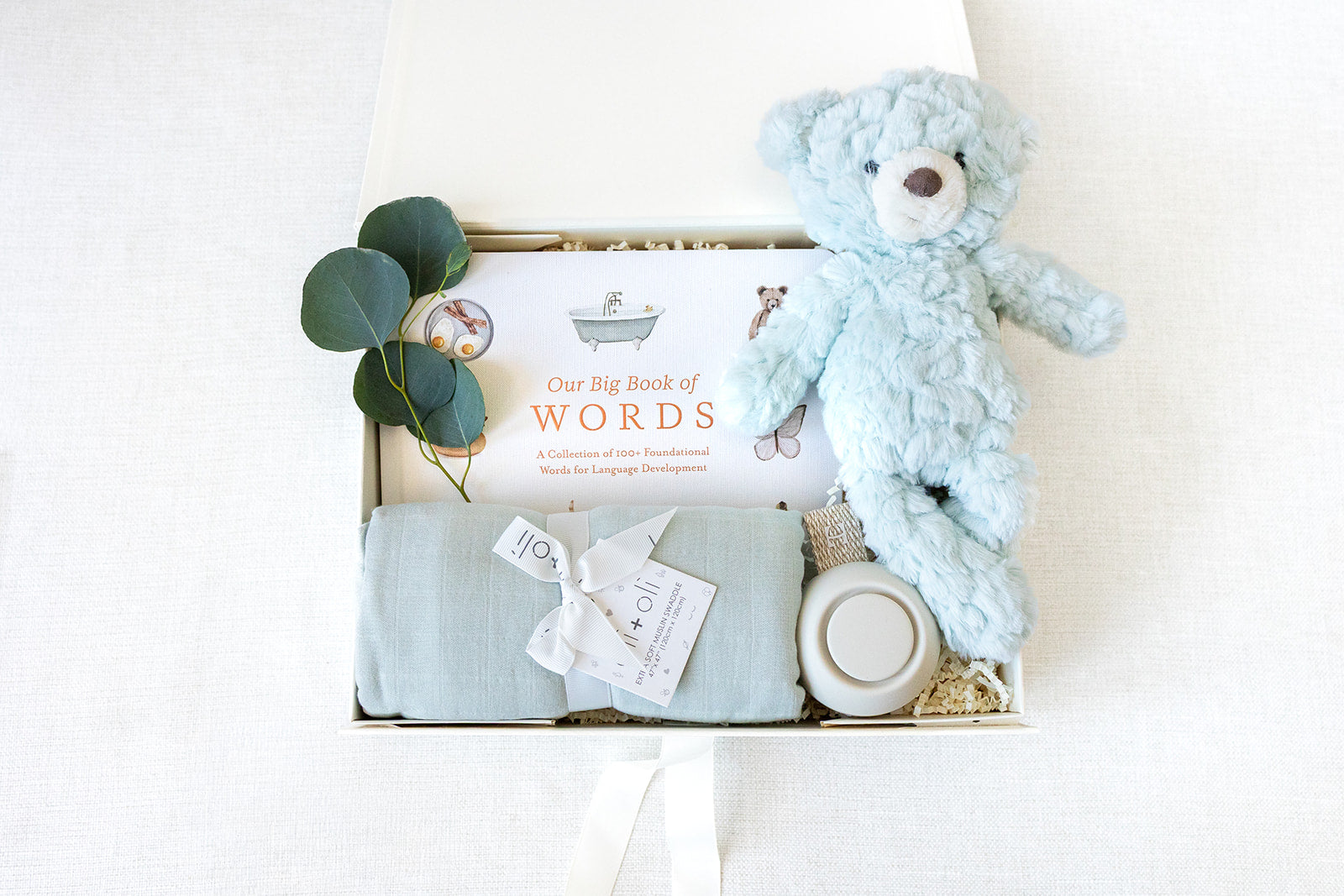 The Welcome Little One Sky gift box by LUX BOX co. includes a blue teddy bear, “Our Big Book of Words” children’s book, eucalyptus sprig, folded blue blanket, and a round white lidded container.