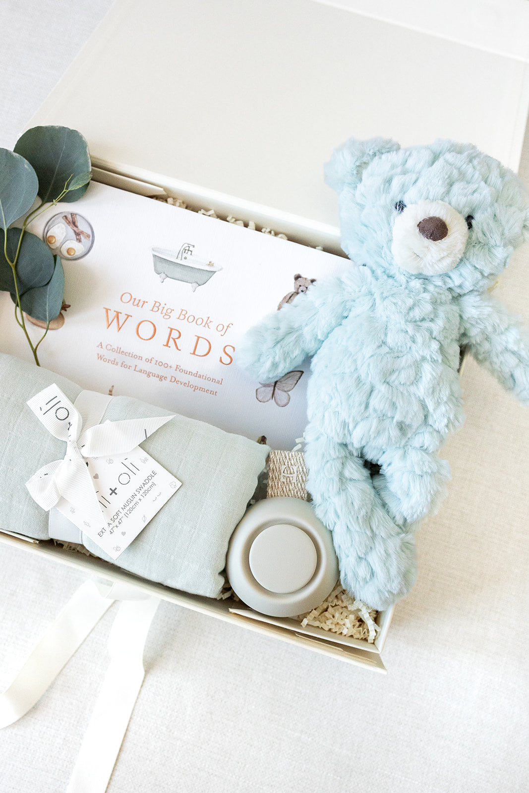 The Welcome Little One Sky by LUX BOX co. is a gift box featuring a blue plush teddy bear, "Our Big Book of Words," a folded mint green cloth, pacifier with clip, and eucalyptus sprigs arranged neatly inside.