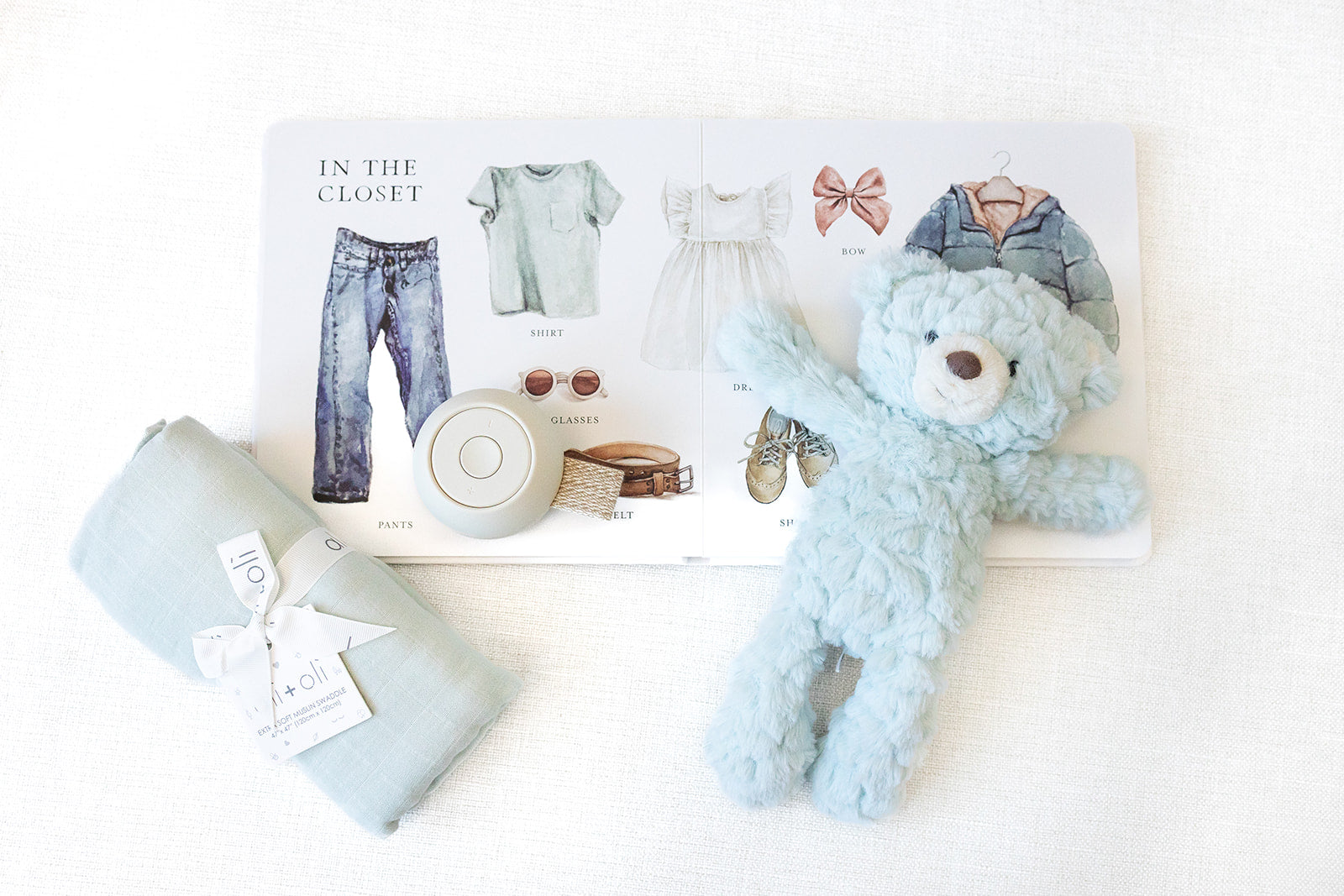 The Welcome Little One Sky set by LUX BOX co. features a soft blue baby blanket, a plush teddy bear, and an open children’s picture book with illustrated clothes and accessories, all arranged on a white surface.